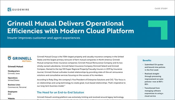 Implementing InsuranceSuite on Guidewire Cloud, Grinnell Mutual achieved business agility, better engagement, and the ability to focus on strategic tasks while transferring routine IT responsibilities to Guidewire, thereby driving more value for their stakeholders.