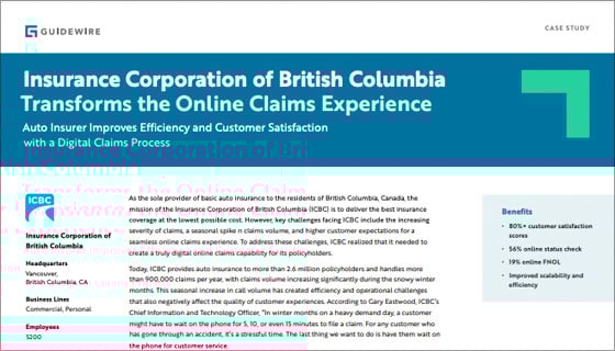 To address these challenges, the company has taken advantage of digital technologies to better serve its customers, claimants, and brokers; to update and improve its products and pricing; and to introduce new industry-standard offerings. After deploying Guidewire’s end-to-end claims management system, Guidewire ClaimCenter, ICBC then implemented Guidewire PolicyCenter.