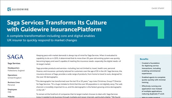 By selecting Guidewire, Saga is on track to transform all lines of business and migrate policyholders at renewal. The insurer will be able to render customer functionality more efficiently, increase responsiveness by reducing time-to-market for new and improved products, and be better placed to follow meaningful customer conversations dynamically. Internally, Saga looks forward to improved operational efficiencies by streamlining and standardizing processes on a modern platform, providing users with a single view of data across the organization and a system that is more intuitive and requires less user training.