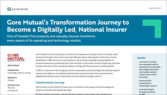 Gore Mutual became the first Canadian insurer to achieve a full InsuranceSuite go-live on Guidewire Cloud. Since that time, it has launched an entirely new operating model in personal lines automobile and a national contact center that is highly automated and scalable. It has completely redesigned its claims operating model, bringing deep specialization and standardization to that business. It has seen over $20 million of recurring cost savings coming out of its claims business.
