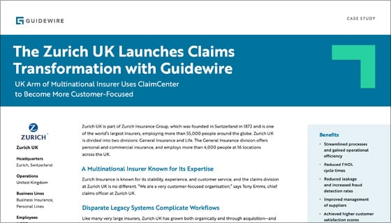 That customer-centric approach has meant deploying, with assistance from Ernst & Young LLP, Guidewire ClaimCenter in the Japan market. Customers can now self-check their claims status and see faster claims settlement time frames. Similarly, Zurich UK, with the help of Capgemini Financial Services UK, transformed its end-to-end claims management program to reduce costs and improve the customer experience.