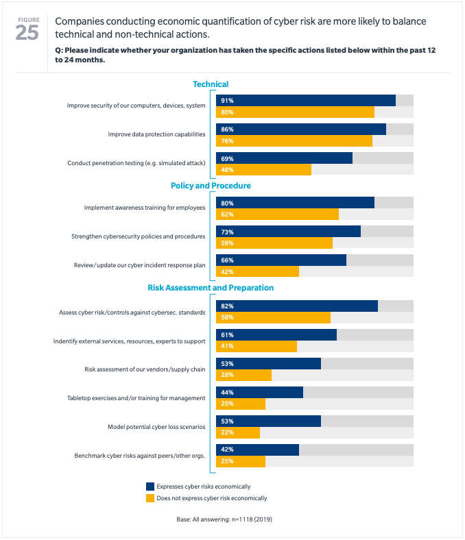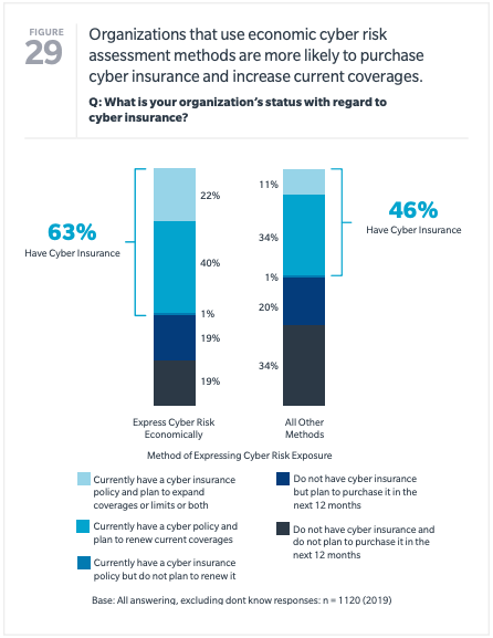 Another way to invest in a cybersecurity solution is to quantify the economic impact of cyber risk exposure. Organizations don’t realize the financial implications or potential monetary loss without seeing a dollar sign associated with their risk exposure. The results often shock them. In contrast, those enterprises that do adopt a quantitative measurement of cyber risk exposure realize the importance of having resilience to assure business continuity. In fact, the survey shows that organizations that use economic cyber risk assessment methods are more likely to purchase cyber insurance and increase current coverages.