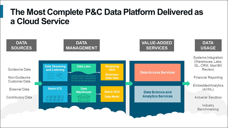 The data platform gathers data from a number of sources, such as core systems and external and third-party data sources, as well as contributory data from the Guidewire customer community. Data is collected into both a data lake–type repository through streaming and a data warehouse–type repository through batch ETL.