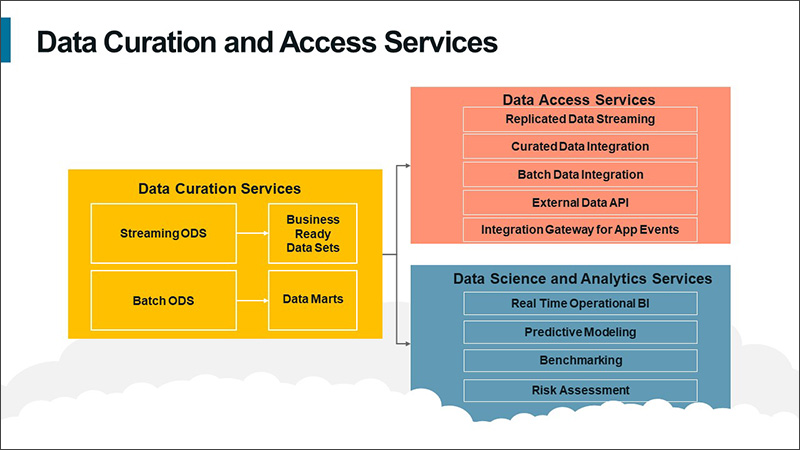 These are services to enable easy access to data in both synchronous and asynchronous manners. For data access in near real time at a low latency, use the replicated data streaming (Cloud Data Access) and the curated data access (Data Studio) services. Additional services enable data access in batch mode and through APIs for external data collected through the data listening engine. The Integration Gateway provides synchronous subscription and consumption of business events.