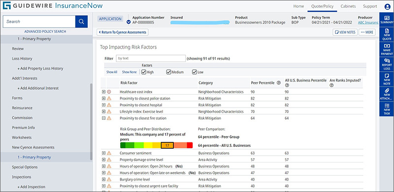 Insurers have been benefitting from embedded analytics in InsuranceNow since the 2019.1 release, when Guidewire Predictive Analytics was first integrated with InsuranceNow. The integration enables key analytics to be surfaced directly from InsuranceNow workflows, providing users with insights needed to make smarter, faster decisions in the moment. The Aspen and Banff releases built on this by providing more direct access to reports and dashboards directly from InsuranceNow and providing additional financial, fee, and tax reports out-of-the-box. In addition, the ability to access actionable insights in the moment continues with the Cortina release, with new integration to Cyence for Small Business. Underwriters can now assess prospects’ small-commercial risk profiles in one glance directly from InsuranceNow through the new risk factor dashboard.